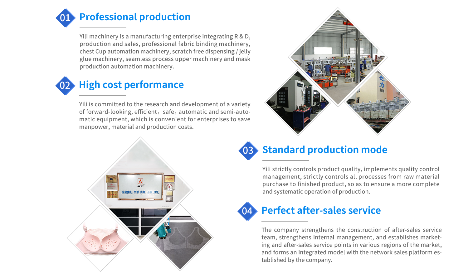 Yili machinery is an enterprises which combines R&D,producing fabric laminating machinery, bra cups molding machinery, and seamless shoe-processing machinery.